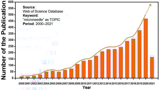 Microneedles were developed in 1976 and used for transdermal drug delivery in 1998. They have been intensively studied over the past half-century (Figure 2) [,,,,,,,,,,,]. A “Web of Science” search with the topic of “microneedle” yielded 3407 articles published since 2000 (Figure 3), which indicates the rapid increase of microneedle studies. Moreover, most microneedles are applied in biomedical areas, especially for cancer therapy, skin disease therapy, insulin delivery for diabetes treatment, blood glucose level detection and vaccines [,,,,,,,,,]. Therefore, in this work, we mainly review the classification, manufacture and biomedical applications of microneedles. The pitfalls of the application of microneedles are also summarized. Given the advantages of microneedle administration, it is promising to optimize the fabrications of microneedles and avoid their disadvantages in future studies.