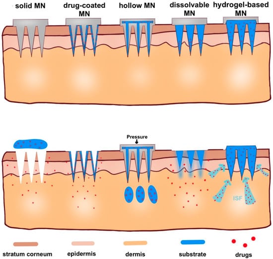 Here, in this review, according to microneedle-based devices, MNs can be divided into five categories: solid, drug-coated, dissolvable, hollow and hydrogel-based microneedles (Figure 4) [,].
