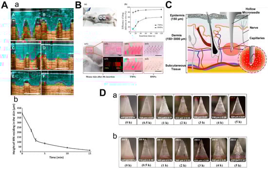 Dissolvable/biodegradable microneedles dissolve completely upon insertion into the skin and have high biocompatibility—because safe polymers can be used as raw materials—and have high loading capacity []. When soluble microneedles were used on mouse ears, the length of microneedles within the skin rapidly decreased to 25% of the initial depth within the first 3 min and then slowly but constantly dissolved over the next 10 min (Figure 5A) []. This feature can be used for sustained drug delivery, but it also suggests that patients may need to wait for the microneedles to dissolve in the skin. Thus, Wang et al. designed a kind of microneedle which had bubble-structure microstructures in the body of the needle. The bubble structure promotes the concentration of the drug to the needle tip and enables the drug delivery efficiency to reach over 8% in 20 s in mice (Figure 5B) []. However, attention should be paid to whether the mechanical characteristics can be maintained in a humid environment [].