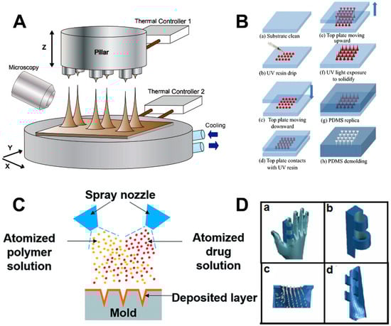 Illustration of methods for making microneedles under different conditions. (A) The shape of the microneedle is fixed by heating–cooling thermal controller. (B) Fabrication process of the microneedle mold by UV. (C) Scheme of dual-nozzle spray deposition process. (D) Scheme of producing a personalized microneedle by 3D printing. (Images were reproduced with permission from [,,,]).