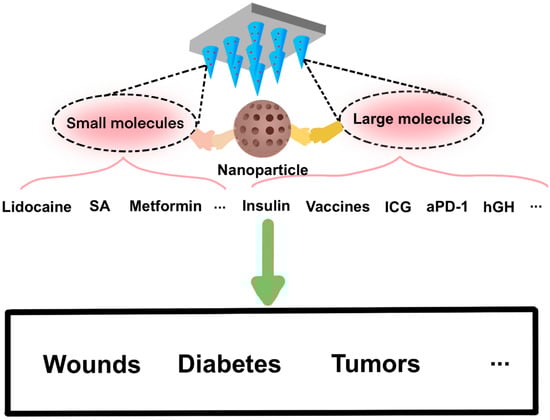 Schematic representation of MNs with small and large molecules in the application of wounds repair, diabetes and tumor therapy.