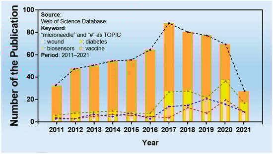 Besides cancer therapy, which is the same as other reviews summarized in [], the main part of this review focuses on the application of microneedles in the areas of skin wound therapy, diabetes treatment, vaccines and sensors. A total of 978 articles published since 2011 were retrieved with the keyword “microneedle” in combination with “wound”, “diabetes”, “vaccine” or “biosensors” from Web of Science. The number of articles fluctuated but gradually increased over the years. Figure 8 summarizes the number of articles published on different topics in the last decade.