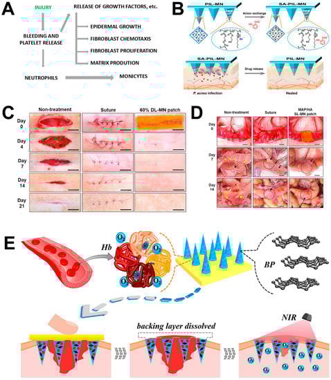 Schematic diagram of the principle and the wounds by microneedle therapy. (A) Inflammatory responses after microneedle was applied to the skin. (B) Release of SA from SA-IL-MNs. (C,D) Macroscopic images of skin or ileum wounds in DL-MN (double-layer-MN) treated rats. (E) Schematic diagram of the BP-loaded, oxygen-carrying responsive MNs in wound healing. (Images were reproduced with permission from [,,,]).