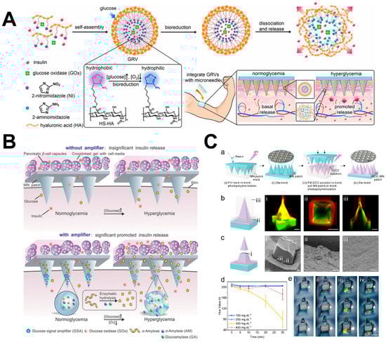 Illustration of microneedles for the diagnosis and therapy of diabetes. (A) Illustration of an insulin-releasing microneedle to detect glucose level. (B) Schematic diagram of a microneedle that can be used as a glucose signal amplifier (GSA). (C) Schematic diagram of painless patch for detecting blood sugar by colorimetry. (Images were reproduced with permission from [,,]).