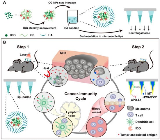 Microneedles with nanoparticles are very promising for the treatment of superficial tumors. After reporting MNs loaded with pH-responsive tumor-targeted lipid-coated cisplatin nanoparticles, Su and his colleagues further investigated a novel MN to achieve synergistic immuno-chemotherapy with antibodies anti-programmed cell death protein 1/cisplatin-diammineplatinum@NPs (aPD-1/CDDP@NPs). Notably, MNs increased the response rates in squamous-cell carcinoma mice models in which there was no response with a single aPD-1 treatment. Thus, the MNs showed promise for the treatment of cancers []. Similarly, Yang et al. reported a strategic topical and targeted photothermal therapy (PTT) mediated by a microneedle system (Figure 11). The indocyanine green was entrapped in chitosan nanoparticles and deposited on the tip of the needle. This indocyanine green-NP (ICG-NP) MN therapy combined with Near Infrared (NIR) irradiation could effectively inhibit melanoma growth early on by destroying most tumor cells. Furthermore, after being combining with antiprogrammed death-ligand 1/indoleamine 2,3-dioxygenase inhibitor indoximod chitosan microneedles (aPD-L1/1-MT CSMNs), tumor growth was completely inhibited within 10 days [].