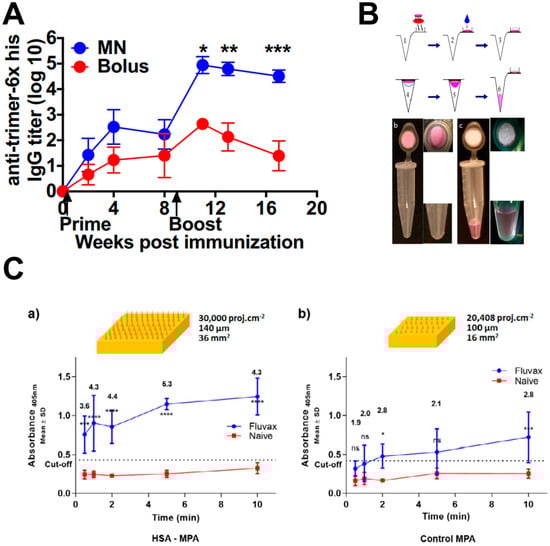 Analytical diagrams and schematics of microneedles used for vaccines and biosensors. (A) Enzyme-linked immunosorbent assay (ELISA) analyses of anti-trimer serum IgG responses over time in strong trimeric-specific humoral response maintained by MNs. (B) Procedures of microneedles to extract tissue fluid. (C) Fluvax IgG was captured from immunized mice to a certain extent by microneedles with different surface areas. In (A,C), 2-way ANOVA analysis is applied, and the significant difference is indicated by * p < 0.05, ** p < 0.01, *** p < 0.001, **** p < 0.0010, while n.s. indicates no significant difference. (Images were reproduced with permission from [,,]).