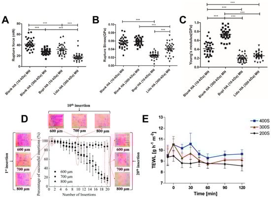 (A) Rupture forces of four types of MNs. (B) Rupture stress of four types of MNs. (C) Young’s modulus of four types of MNs. (D) The relationship between PLA MN insertion success rate and insertion times with different heights (600, 700 and 800 μm). (E) Skin irritation and barrier disruption were assessed by TEWL (200S as 200 µm, 300S as 300 µm, 400S as 400 µm). In (A–C), one-way ANOVA analysis is applied, and the significant difference is indicated by * p < 0.05, ** p < 0.01, *** p < 0.001. (Image was reproduced with permission from [,,]).