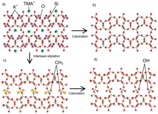 - Kiba, S.; Itagaki, T.; Nakato, T.; Kuroda, K. Interlayer modification of a layered H-octosilicate (H-RUB-18) with methanol: Formation of a highly ordered organosilicate nanohybrid. J. Mater. Chem. 2010, 20, 3202–3210. [Google Scholar] [CrossRef]