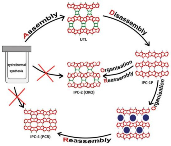 - Eliasova, P.; Opanasenko, M.; Wheatley, P.S.; Shamzhy, M.; Mazur, M.; Nachtigall, P.; Roth, W.J.; Morris, R.E.; Cejka, J. The ADOR mechanism for the synthesis of new zeolites. Chem. Soc. Rev. 2015, 44, 7177–7206. [Google Scholar] [CrossRef]