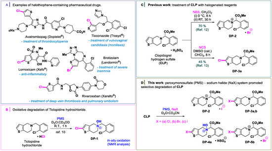 Halothiophene-containing pharmaceutical drugs and representative oxidation of CLP. (A) Examples of halothiophene-containing pharmaceutical drugs. (B) Our previous work: oxidative degradation of ticlopidine hydrochloride with PMS. (C) Previous work: treatment of CLP with halogenated succinimides. (D) This work: PMS-halide oxidation of CLP, anions may be halide or hydrogen sulfate.