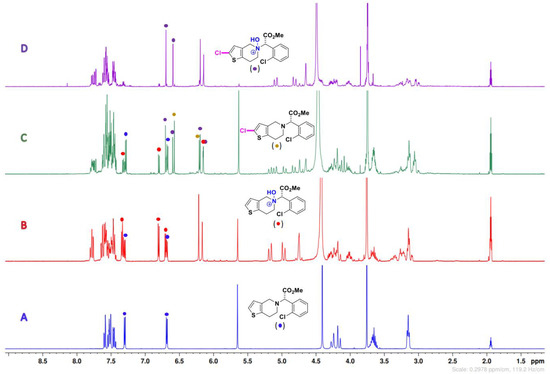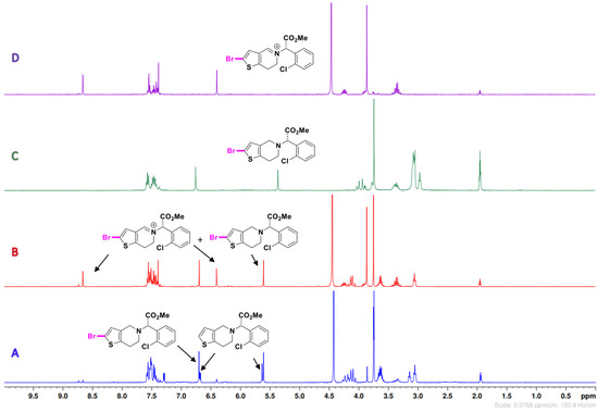 In Figure 2, a compilation of the 1H NMR spectra on the main functional transformations that occurred in the oxidative process, which resulted in the formation of the products in high yields, is shown. In addition, the data of the starting materials (as reference) and non-chlorinated intermediates DP-6 (mixture of diastereomers) are also included in this compilation of spectra, as described in Figure 2A,B [37]. The main observation among the NMR spectra of this work is the disappearance of the doublet (δH ~6.7 ppm, CD3CN) of proton H-3 of the thiophene ring and a conversion into a singlet in that same region which results from the insertion of a heteroatom at carbon-2 of this heterocycle (Figure 2C).
