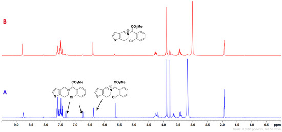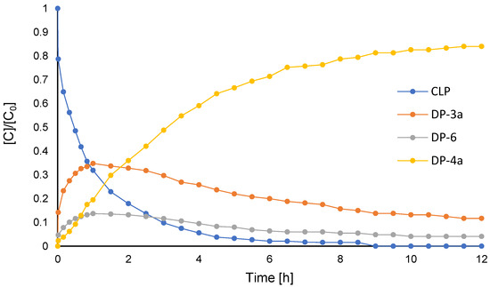 Figure 2C represents the progress of oxidative chlorination of CLP and NaCl after two hours (Table 1, Entry 12). In the first two hours of reaction, we observed the appearance of non-halogenated diastereomers of intermediate DP-6 with a new N+-OH bond, as well as the mono-chlorinated compound DP-3a. As the reaction progressed towards the production of DP-4a, the signals of DP-6 and DP-3a decreased in the spectrum. This led us to conclude that the reaction pathway to obtain DP-4a occurred via two simultaneous processes: oxidation-chlorination via DP-6 and chlorination-oxidation via DP-3a (Figure 3). The final product, DP-4a, is represented in Figure 4D, and bears a chlorine on the thiophene ring and an N-oxide in the piperidine structure. The mechanism of this reaction was shown in our previous work [31].