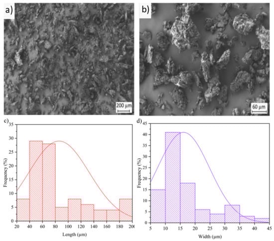 (a) Field emission scanning electron microscopy (FESEM) images of micronized pistachio shell flour (PSF) taken with a magnification of 50× and a scale marker of 200 µm; (b) FESEM image of PSF taken with a magnification of 200× and a scale marker of 60 µm; (c) histogram of the PSF particle length; (d) histogram of the PSF particle width.