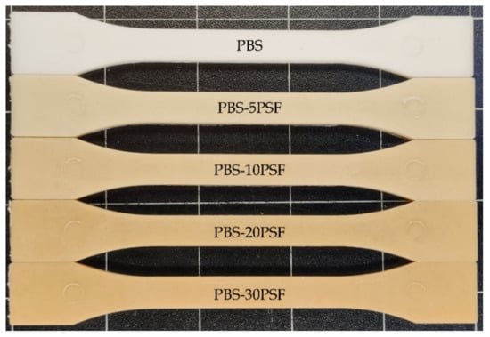 Figure 2 shows the resultant injection-molded pieces of the PBS and PBS/PSF composites at different filler loadings. This visual appearance is essential in the role that an end product plays in consumers and applications. One can observe that the unfilled PBS sample showed a “cream” color with no transparency. Then, the pieces developed a light brown color when the micronized powder of PSF was added to PBS, which was progressively intensified as a function of the filler content. This color variation can be mainly ascribed to the intrinsic yellow-to-brown color of PSF. However, the strong color variations, particularly at the highest filler contents, can also be influenced by the local high temperature increases that could occur during melt mixing of these formulations due to their higher specific mechanical energy.