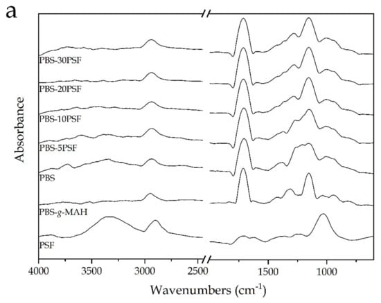 Figure 4 shows the attenuated total reflection-Fourier transform infrared (ATR-FTIR) spectra of the PSF powder, the PBS-g-MAH dough, and the injection-molded pieces of neat PBS and its green composites with PSF and PBS-g-MAH. It can be seen in Figure 4a that the FTIR spectrum of PSF was mainly characterized by the presence of three strong peaks. It can be observed the first broad and intense band at ~1035 cm−1 wavelength, which can be correlated with C–O stretching vibrations in alcohols and phenols of lignocellulose, and it belongs to the polyglykosidic moieties (polyol) []. Then, the second strong peak arose at 2910 cm−1, and it corresponds to ν(C–H) vibrations in methyl (–CH3) and methylene (–CH2–) groups of cellulose and lignin []. This band has been indicated to be contrary to the δ(C–H) vibrational bands for –CH3 and –CH2– groups due to the skeletal C–C vibrations in aromatic rings, which were also found for pistachio nut shells and located herein at around 1263 and 1412 cm−1 []. The latter bands overlapped with those attributed to C–O–H in-plane bending and C–O stretching for carboxyl (–COOH) groups in lignin []. Finally, the third and also broad peak seen in the region of 3000–3600 cm−1 is indicative of the large presence of hydroxyl (–OH) groups in pistachio shell []. Other minor peaks were seen at 1664 cm−1, which occurs due to C=C vibrations in aromatic rings and olefinic ν(C–C) absorptions present in lignin, and at 1735 cm−1 due to the C=O stretching of the carbonyl (C=O) group, which is mainly associated with hemicellulose []. Therefore, from the FTIR spectrum of PSF, it was confirmed the lignocellulosic nature of the food waste derived filler as well as the presence of several oxygen groups on its chemical structure such as carbonyl groups, ethers, esters, alcohols, and phenol groups.