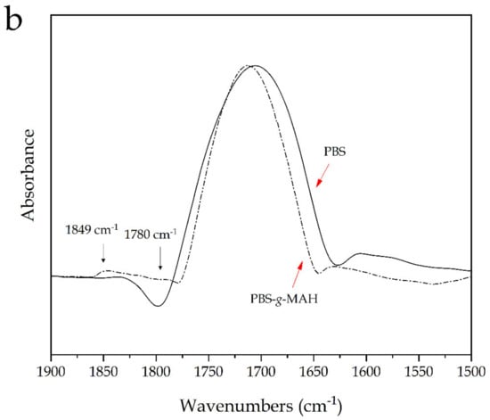 The outcome of the MAH grafting onto PBS was also investigated by FTIR. The strongest absorption signal was the one attributed to the C=O stretching vibrations of ester groups in PBS, which slightly shifted to ~1720 cm−1 and also narrowed due to crystalline phase disruption and potential loss. By comparison of the PBS-g-MAH and PBS spectra in the 1900–1500 cm−1 region, one can observe in Figure 4b that there was a new signal absorption band at 1849 cm−1, which is characteristic for succinic anhydride groups and has been formerly attributed to the symmetric C=O stretching bonds of MAH []. Furthermore, this was accompanied by a signal level increase at nearly 1780 cm−1, corresponding to their symmetric stretching. Moreover, the peak related to ν(C–H) vibration of PBS was shifted in the PBS-g-MAH spectrum from approximately 2965 cm−1 to 2980 cm−1 as a result of the grafting process since it could be affected by the =CH2 vibration of the cyclic MAH that was reported to arise at 3058 cm−1. Although the band changes in the PBS-g-MAH were subtle, these have already served to demonstrate the reactive grafting process of MAH at the diol unit of PBS [,]. All these newly formed bands and band distortions are, thus, representative of the functional groups available in the grafted biopolymer [,,,]. In addition to this, these new peaks did not appear in either the neat PBS spectrum or green composite spectra, suggesting that these groups were removed or consumed during melt grafting.