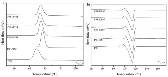 Differential scanning calorimetry (DSC) thermograms taken during cooling (a) and second heating (b) of the injection-molded pieces of poly(butylene succinate) (PBS)/pistachio shell flour (PSF) compatibilized with poly(butylene succinate) grafted with maleic anhydride (PBS-g-MAH).