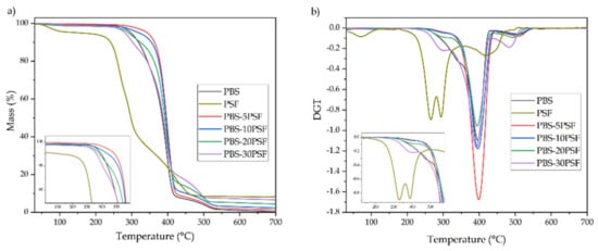 Figure 7 shows the thermogravimetric analysis (TGA) and first derivative thermogravimetry (DTG) curves, respectively gathered in Figure 7a,b, for the PBS pieces and their green composite pieces with different contents of PSF. Table 4 presents the main thermal parameters obtained from the thermogravimetric curves, that is, the onset degradation temperature that was considered for the temperature with a loss of 5% (T5%), temperature of maximum degradation (Tdeg), corresponding to the maximum degradation rate and identified in the corresponding DTG curves, and residual mass at 700 °C. In the case of PSF, like other biomass, three different mass losses were seen during the degradation process, which have been ascribed to drying, devolatilization, and charring []. The first mass loss, at ~100 °C, is related to the removal of moisture present in the lignocellulosic material. The second one, in the thermal range from 200 to 400 °C, represents the thermal decomposition of holocellulose, that is, the degradation of hemicellulose (210–325 °C) and cellulose (310–400 °C) []. This zone is known as the “active pyrolysis zone” due to its high rate of devolatilization, where occurs the majority of the pyrolysis with a mass loss of ~55% []. Finally, the third zone of degradation started at approximately 310 °C, and it corresponds to the thermal decomposition of the rest of cellulose and lignin, which occurs from 400 °C. This stage is termed “passive pyrolysis” since the mass loss rate is lower compared with the previous stage, and it can be seen as a tailing section in the DGT curve [].