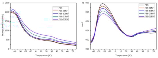 Evolution as function of the temperature of the storage modulus (a) and dynamic damping factor (tan δ) (b) of the injection-molded pieces of poly(butylene succinate) (PBS)/pistachio shell flour (PSF) compatibilized with poly(butylene succinate) grafted with maleic anhydride (PBS-g-MAH).