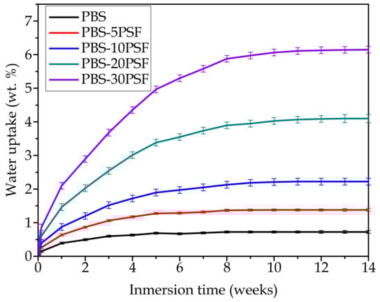 Figure 9 shows the evolution of water uptake with time in a 14-week immersion period for the PBS pieces and the PBS/PSF composite pieces. In the case of the neat PBS piece, it reached an absorption value of ~0.73 wt.% after 14 weeks of immersion in water. A similar value was reported previously by Frollini et al. [], confirming the high hydrophobicity of this biopolyester. Furthermore, it can be observed in the graph that the introduction of the lignocellulosic fillers notably increased the amount of water absorbed in the material during the immersion period. In general, a direct relationship can be observed between the amount of this type of waste derived filler, based on lignocellulose and the total water absorbed in the polymer composite sample []. This fact is ascribed to the hydrophilic nature of lignocellulose due to the large amount of free –OH groups on the filler surface []. For instance, water uptake increased up to 2.23 wt.% for the green composite pieces filled with 10 wt.% PSF, that is, PBS-10PSF, whereas it reached a value of 6.14 wt.% for a 30 wt.% filler loading, that is, PBS-30PSF. In this regard, Gairola et al. [] also reported that PSF shows a great tendency to entrap water, showing a value of water absorption of 2.75 wt.% after 7 days for a thermosetting epoxy composite with 10 wt.% PSF. Nevertheless, it is worth remarking that all these tests were carried out using injection-molded pieces that were laterally uncoated when fully immersed in water, which may represent more aggressive conditions than those typically found for end-use applications of WPCs.