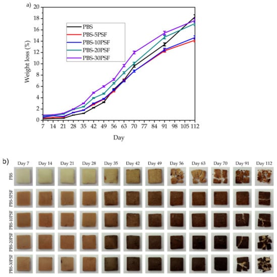 The disintegration behavior of the PBS and PBS/PSF pieces under controlled composting conditions was analyzed for a period of 112 days, that is, 16 weeks. This timeframe goes beyond the “reasonably short period of time” described in international standards of compostability. In particular, the EN 13432 or ASTM D6400 standards require the plastic articles certified as compostable to disintegrate after 12 weeks or 84 days, and completely biodegrade after 180 days, which means that at least 90% of the bioplastic material will have been converted to carbon dioxide (CO2), water, and biomass. Figure 10 shows results of the disintegration tests in terms of the evolution of the percentage of weight loss (Figure 10a) and the visual aspect of the pieces at each tested time during composting (Figure 10b). It can be observed that, during the first 4 weeks of composting, the mass loss was very subtle, and the visual aspect of the pieces remained nearly unaltered. Then, higher rates of disintegration were observed after nearly 35 days of composting, from which all the PBS samples started to loss mass relatively fast whereas the piece surfaces were seen to be eroded. From the week 6 up to approximately 3 months, the pieces showed a linear and very steep degradation progression. At this time, however, the degradation rate was noticeably reduced, and the mass loss reached a value of approximately 20 wt.% at the end of the test. In this regard, it is worth noting that the test was conducted at 58 °C and 55% RH, which are certainly favorable conditions in terms of high temperature and humidity for the hydrolytic degradation of PBS. On the base of the here-attained uncompleted disintegration process, other authors [,] also found a similar degradation profile for PBS, identifying three phases with different degradation speeds, namely the lag phase with a low rate (<5 days), biodegradation phase where the rate was accelerated (6–66 days), and plateau phase in which disintegration leveled off (>67 days). Authors also concluded that the shape and format of the PBS articles played a major role during disintegration in controlled compost. In particular, whereas PBS powder with an average particle size of 42 μm and the resultant 40 μm thermo-compressed film sizing 1 cm x 1 cm showed biodegradation percentages after 90 days of 71.9 and 60.7 wt.%, respectively, the as-received granules of ~3 mm only disintegrated up to 14.1 wt.%. It was then confirmed that biodegradability of PBS under composting conditions is mainly controlled by the sample’s specific surface area. In another study, it was observed that PBS sheet samples of 30 mm × 30 mm × 1 mm were discolored after 1 month and their surface was completely damaged by the microorganisms of biodegradation after 3 months, but the sheets did not fully disintegrate in 5 months [] Therefore, the previous finding supports and agrees with the percentages of degradation achieved herein for the injection-molded pieces of PBS with a thickness of 4 mm, which was approximately 13.4 wt.% for 91 days and 18.3 wt.% at the end of the test, that is, after 112 days.