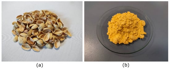 PSF was obtained from Micronizados Vegetales S.L. (Córdoba, Spain) as a waste of the food industry. The pistachio shells were cleaned and ground into powder form using a jaw crusher. The collected powder was then sieved to obtain a flour composed of particles with a mean size of less than 75 µm. The raw pistachio shells and the resultant flour in powder form are shown in Figure 11.