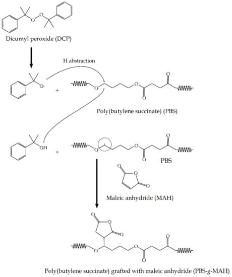 Figure 12 shows the reaction mechanism to obtain the grafted material, that is, PBS-g-MAH. The reaction starts with the peroxide decomposition to form the primary DCP free radicals (I) that abstract the hydrogen atom from PBS backbone to yield PBS macroradicals during the initiation step (II). These biopolymer macroradicals are formed mainly from chain transfer reactions by free radicals that are generated from thermal decomposition of organic initiators []. The resultant macroradicals propagated and set off the grafting of MAH onto PBS (III). The reaction continued until the resultant PBS-MAH macroradicals might undergo hydrogen transfer from another biopolymer chains, MAH, or the initiator and formed the so-called PBS-g-MAH (IV). Alternatively, the PBS-MAH macroradicals can react with other radicals in the system, such as MAH, PBS, or primary radicals to form a different structure of PBS-g-MAH (V). The formation of side groups and side chains is mainly due to addition of PBS macroradicals to the double bond of MAH molecules and also the combination of PBS macroradicals with those of PBS-MAH. In this regard, it should be considered that other unwanted reaction pathways could occur, for example, the homopolymerization of MAH, that is, PBS-(MAH-)n, resulting in a product with higher grafting degree but lesser compatibilization efficiency.