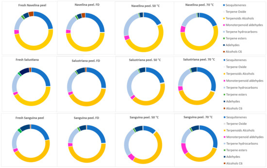 In general, Figure 1 shows the percentage of every chemical family from Navelina, Salustriana, and Sanguina peels, and the effect of fresh/heat treatment.