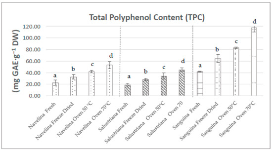 The total phenolic contents (TPC) of peel extracts from Salustriana (Citrus sinensis L. Osbeck cv. “Salustriana”), Navelina (Citrus sinensis L. Osbeck cv. “Navelina”), and Sanguina (Citrus x sinensis var. “Sanguina”) were analyzed in fresh, oven-dried at (OD 50–70 °C), and freeze-dried states. The classification of these orange peel extracts based on the highest TPC index was Sanguina > Navelina > Salustriana, as can be seen in Figure 2.