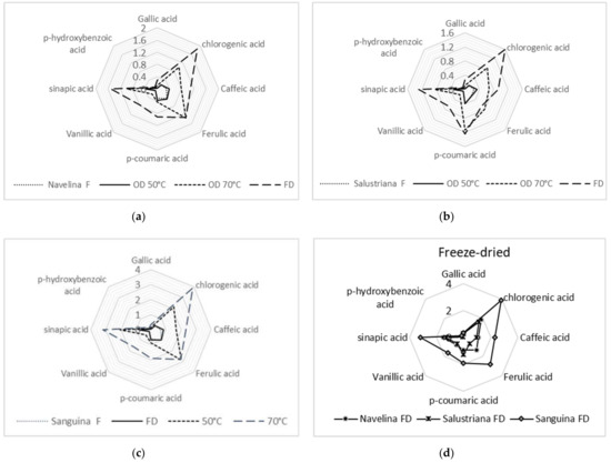 Phenolic acids (mg g−1 DW) of Navelina (a), Salustriana (b), and Sanguina peels (c), fresh (F), after freeze-drying (FD), and after oven-drying (OD-50 °C, OD-70 °C). (d) shows the comparison between the three FD orange peels.