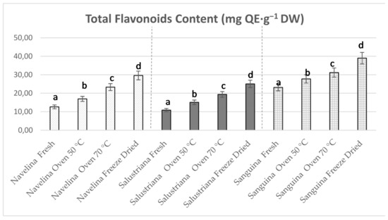 Our results revealed that freeze-dried samples showed the highest values of (p < 0.05) TFC displaying 29.61, 25.05, and 39.00 mg QE·g−1 DW in Navelina, Salustriana, and Sanguina peels, respectively (Figure 4). This conduct is probably due to the reduction of water content (concentrating the TFG), together with the low temperature during freeze-drying that preserved the flavonoids, avoiding their thermal degradation. Therefore, data suggest the suitability of FD treatment couple with pressurized ASE isolation to improve the total flavonoids of orange peel extracts that could be used for the reformulation of functional foods.