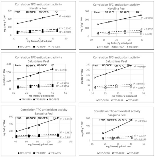 The TPC levels were variable depending on the drying treatment. Thus, TPC of Navelina, Salustriana, and Sanguina peels extracts dried at 50 °C (30.50, 27.16, 64.36 mg GAE·g−1 DW, respectively) were significantly higher (p < 0.05) than those found in fresh peels (22.75, 19.55, 41.66 mg GAE·g−1 DW). These levels were enhanced with oven-drying at 70 °C, reaching 42.00, 31.27, 83.15 mg GAE·g−1 DW, respectively. Our results were similar to those reported by Jeong et al. [67], mentioning enhancements of TPC in Citrus unshiu peels as the heating temperature increased. Increases of TPC during drying at 70 °C from their precursors by non-enzymatic interconversion between phenolic molecules have also been reported [80].