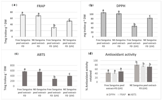 At the same time, the highest levels of TPC were noted in freeze-dried (FD) extracts from Navelina, Salustriana, and Sanguina peels; they increased two/three-fold compared to their respective fresh peels (Figure 2). Our results were similar to those reported by Farahmandfar et al. [67] who reported remarkable increases in the TPC levels in FD-Navel peels (Citrus sinensis L. Osbeck) in comparison with those oven-dried at 45–60 °C.