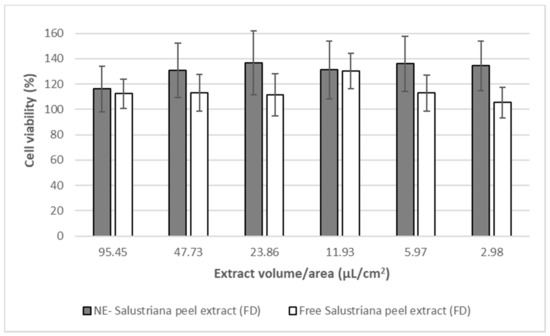 The effect of nanoemulsions on cell viability was studied in Caco-2 cells by the crystal violet assay. Firstly, 2 × 104 cells/well were seeded in 96-well plates and incubated at 37 °C for 24 h. Then, the medium was removed and different aliquots of nanoemulsions and extract dispersed in medium (3–95.5 μL/cm2) were added to the cells, which were further maintained at 37 °C for 24 h. After that period of incubation, the formulations were removed, 100 μL of a 0.5% (w/v) crystal violet staining solution was added to each well and further incubated at 37 °C for 30 min. Cells were washed twice with ultrapure water and left to dry at room temperature for 30 min. Finally, 100 μL of methanol was added to each well and maintained for 30 min with horizontal shaking. Optical density was measured at 570 nm with a plate reader, considering cells treated with DMEM and Triton-X 100 as negative and positive controls.