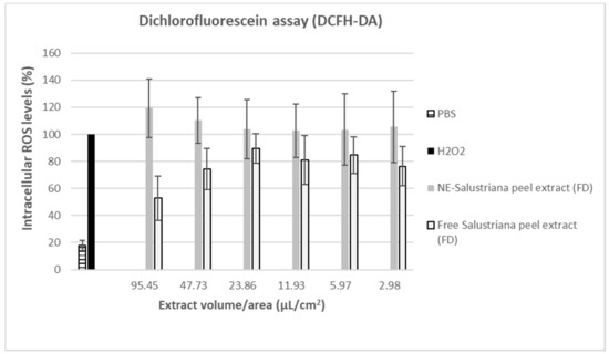 The effect of nanoemulsions on the intracellular ROS levels was studied in Caco-2 cells by the dichlorofluorescein (DCFH-DA) assay. Firstly, 2 × 104 cells/well were seeded in 96-well plates and incubated at 37 °C for 24 h. Then, the medium was removed and different aliquots of nanoemulsions and extract dispersed in medium (3–95.5 μL/cm2) were added to the cells, which were further maintained at 37 °C for 24 h. Then, cells were washed and 100 μL of DCFH-DA (10 μM) was added and further incubated at 37 °C for 60 min protected from light. After those incubations, cells were washed and 100 μL of H2O2 0.3% (v/v) was added to each well and incubated for 30 min at room temperature protected from light. Supernatants were collected and transferred to black flat-bottom 96-well plates (Cultek, Spain). The measurement of the fluorescent oxidized derivative of DCFH-DA was performed in a plate reader (BMG Labtech’s) using emission and excitation wavelengths of 475 and 125 nm, respectively. The treatments H2O2 and PBS were considered as positive and negative controls, respectively.