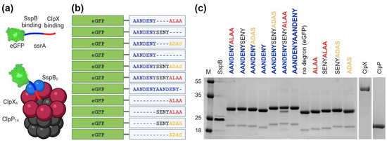 - Hersch, G.L.; Baker, T.A.; Sauer, R.T. SspB delivery of substrates for ClpXP proteolysis probed by the design of improved degradation tags. Proc. Natl. Acad. Sci. USA 2004, 101, 12136–12141. [Google Scholar] [CrossRef] [PubMed] [Green Version]