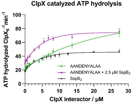 The in vitro assay of ClpX ATPase activity. ATP hydrolysis catalyzed by ClpX was measured using the NADH coupled assay by monitoring changes in NADH absorbance as a function of time in the presence of increasing concentrations of SspB2 (black curve) and increasing concentrations of eGFP-AANDENYALAA alone (green curve) or with the constant addition of 2.5 µM SspB2 (violet line). Data are presented as means with error bars as SEM for at least three technical replicates.