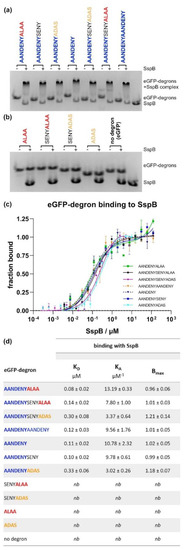 The in vitro study of SspB binding to eGFP-degron proteins. (a,b) Native electrophoresis revealed formation of complexes between SspB and eGFP proteins coupled with degrons containing the AANDENY motif (a), in contrast to no visible binding of SspB to eGFP proteins coupled with degrons lacking the AANDENY motif (b). (c) Confirmation of SspB binding to eGFP with degrons containing the AANDENY motif by MST). Data are presented as means with error bars as SEM for at least three technical replicates. (d) Quantification of the binding parameters (KD, KA, and Bmax) based on the analysis of MST data. nb—no detectable binding. Data are presented as mean ± SEM.