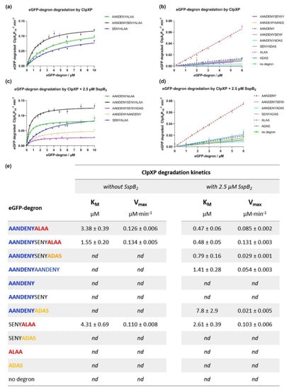 In vitro degradation of eGFP-degron proteins by ClpXP. Evaluation through changes in the eGFP fluorescence in the absence (a,b) or presence of 2.5 µM SspB2 protein (c,d). Data are presented as means with error bars as SEM for at least three technical replicates. (e) The initial rate of protein degradation per ClpX6P14 unit at different eGFP-degrons concentrations was fit to the Michaelis-Menten plot allowing the determination of the process kinetic parameters (KM, Vmax) in the absence (left) or presence of 2.5 µM SspB2 (right); nd—no discernible degradation. Data are presented as mean ± SEM for at least three technical replicates.