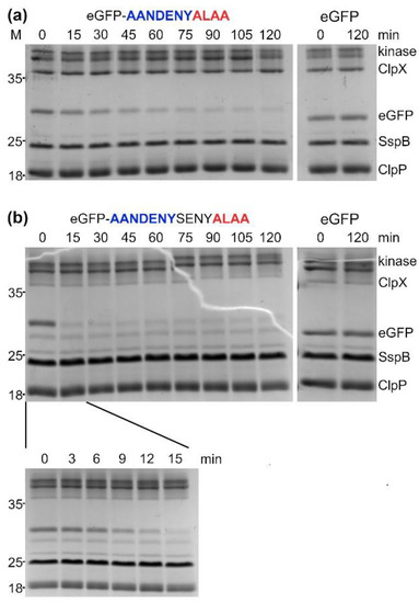 To confirm the stability of the ClpX-ClpP-SspB in vitro degradation was additionally analyzed using SDS-PAGE for the most efficient AANDENYALAA and AANDENYSENYALAA degrons. Substrate removal was faster for AANDENYSENYALAA (~15 min to reach the steady-state level) in comparison with AANDENYALAA (~60 min to reach the steady-state level) (Figure 5a,b). No additional degradation of SspB, ClpXP or the regeneration system components was observed after the degradation of eGFP-degrons, confirming specific substrate removal and stability of the applied assay.