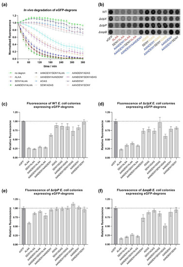 Our results of the in vitro degradation assays obtained for eGFP-degrons were confirmed by additional in vivo analyses carried out in bacterial cultures. Two methods were used: an analysis of changes in eGFP-degron fluorescence either in liquid culture over time (Figure 6a) or in a spot assay on agar plates (Figure 6b). The favored method of comparing degron efficiency was an estimation of the level of eGFP fluorescence of bacterial colonies overexpressing eGFP-degrons in the plate spot assay (Figure 6b). The fluorescence level of eGFP-degrons was determined for WT strain and three mutant strains ΔclpX, ΔclpP and ΔsspB to establish whether ClpX, ClpP or SspB would affect degradation. In the WT strain eGFP-degron degradation resulted in the fastest and largest decrease in fluorescence for AANDENYALAA, ALAA, SENYALAA, and AANDENYSENYALAA degrons (Figure 6a,c). A slower decrease was observed for AANDENYAANDENY, AANDENYSENYADAS, and for the more lagging AANDENYADAS (Figure 6a), correlating also with the lower fluorescence level in the spot assay for these three degrons (Figure 6b). AANDENY, AANDENYSENY, ADAS, and SENYADAS degrons resulted in only slight decrease in fluorescence, with AANDENY matching the most closely the levels of eGFP without any degron tag (Figure 6a,c). The overall trends in fluorescence levels were similar in the WT, ΔclpX and ΔsspB strains (Figure 6c,d,f), with ALAA-containing degrons causing the most efficient eGFP degradation, and this reduction was the most evident in the ΔsspB strain. For the ΔclpP strain, substantial degradation was observed only for the eGFP-ALAA fusion (Figure 6b,e).
