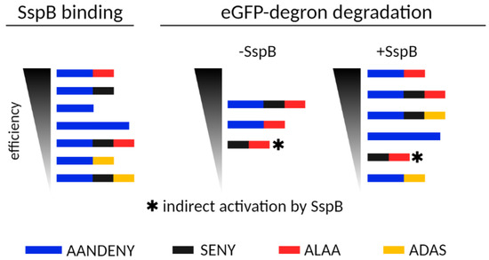 Building on this type of knowledge, degron variants can be fine-tuned for two basic types of applications. We ranked the propensity of the tested ssrA variants for SspB binding and for eGFP-degron degradation (Figure 7), which should facilitate the choice of the degron appropriate to the desired task. If efficient degradation of the fusion protein is desired, the best binding to SspB is provided by the WT ssrA sequence, but in the absence of SspB, AANDENYSENYALAA would be an even better choice. Our results confirm that AANDENYSENYADAS and AANDENYADAS enable degradation which might be regulated by SspB presence [32,33,34]. The SsrA degron is often used simply as an interaction module, for example in photoswitches [35]. In this case, if only promoted interaction with SspB is desired, then AANDENY or AANDENYSENY degrons would be the most suitable choice for efficient tag binding without degradation.