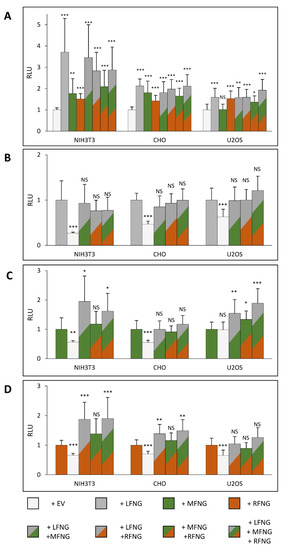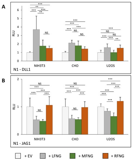 Our first objective was to determine how co-expression of N1 with members of the Fringe family (LFNG, MFNG, or RFNG) modulates Notch signaling within three cell lines commonly used for Notch activation assays (NIH3T3, CHO, and U2OS). To this purpose, mouse N1 was expressed in these cell lines in the presence or absence of co-expressed mouse LFNG, MFNG, or RFNG. The transfected cells were then co-cultured with L cells stably expressing DLL1 or JAG1 (Figure 1A,B). The NIH3T3 and CHO cells showed a similar profile to previously published results [4,8] for induction of N1 signaling by DLL1. All three Fringes enhanced N1 activation by DLL1, but LFNG induced the strongest enhancement of signal compared to MFNG or RFNG. Interestingly, N1 activation in NIH3T3 cells was more sensitive to the presence of LFNG than in CHO cells. Activation of N1 by DLL1 was different in U2OS cells compared to NIH3T3 and CHO cells: LFNG overexpression had less of an effect and MFNG had no effect on N1 signaling (Figure 1A). The results obtained with the activation of the N1 pathway by JAG1 are similar between the three cell lines. Namely, a decrease in N1 signal induction by JAG1 with the co-expression of LFNG or MFNG, although the effect of LFNG was lower in the case of U2OS cells. RFNG tended to increase the signal (significant only for U2OS). However, we did not observe a strong increase in N1 signaling in the presence of RFNG in NIH3T3 cells as described in previous studies [4] (Figure 1B).