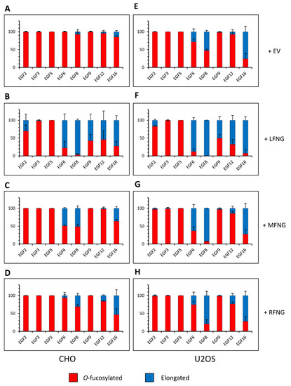 Overexpression of LFNG, MFNG, and RFNG resulted in modification of O-fucose on specific EGFs in CHO and U2OS cells (Figure 3). LFNG modified the most EGFs: EGF2, 6, 8, 9, 12, and 16 (Figure 3B,F). MFNG only modified O-fucose carried by EGF6, 8, and 16 (Figure 3C,G) and RFNG those carried by EGF8, 12, and 16 (Figure 3D,H). We also saw Fringe elongation at EGF18, but due to its position at the C-terminus of the protein, which frees it from the conformational constraints present for the whole receptor containing 36 EGF repeats, and the fact that we could not reliably detect the O-fucosylated peptide from EGF18 (Figure S3), we did not include EGF18 in our analysis. The proportions of the different O-fucose glycoforms also appear to be specific to each cell line (Figures S1 and S2).