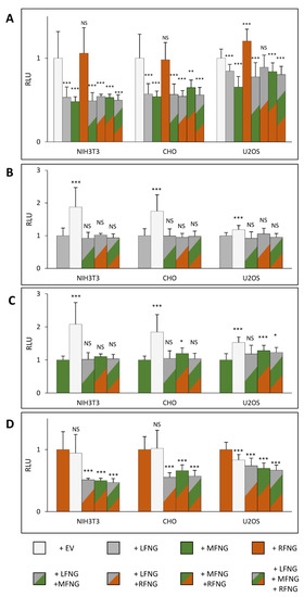 Effect of expressing multiple Fringes on NOTCH1 activation by DLL1. NIH3T3, CHO, and U2OS were co-transfected with plasmids encoding full-length mouse NOTCH1 (N1) and empty vector (EV) or LFNG and/or MFNG and/or RFNG. Then, cell-based co-culture N1 activation assays were performed with L cells stably overexpressing DLL1 as in Figure 1A. Relative Luciferase units (RLU) normalized to EV controls (A), to LFNG (B), to MFNG (C), or to RFNG, (D) (normalized to 1 for each ligand and cell line) were determined. Statistical significance was calculated using one-way ANOVA. Bar graph shows mean +/− SD; four or five independent experiments (depending on the cell line) n = 8 to 10 were analyzed (*** p < 0.005; ** p < 0.01; * p < 0.05; NS: no significance).