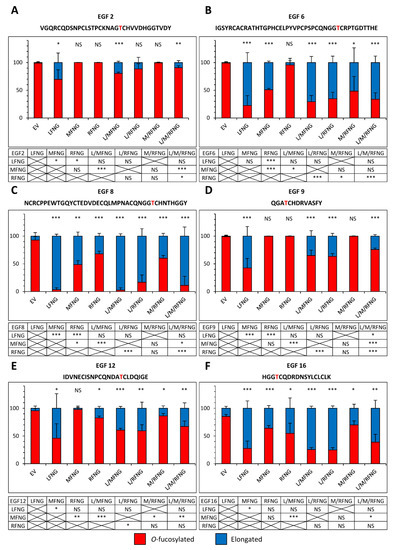 Site-specific O-fucosylation profile of N1 EGF1-18 co-expressed with multiple Fringes in CHO cells. Quantification of the percentage of peptides modified by a monosaccharide O-fucose (red) and elongated O-fucose (blue) by at least a GlcNAc. Extracted ion chromatograms (EICs) of the mass spectrometry (MS) data of peptides for EGF2 (A), 6 (B), 8 (C), 9 (D), 12 (E) and 16 (F) derived from mouse N1 EGF1-18 overexpressed with EV, LFNG, MFNG, RFNG, LFNG + MFNG, LFNG + RFNG, MFNG + RFNG, or LFNG + MFNG + RFNG in CHO were used for the quantification. Statistical significance was calculated using one-way ANOVA. Bar graph shows mean +/− SD; three independent experiments n = 3 were analyzed (*** p < 0.005; ** p < 0.01; * p < 0.05; NS: no significance). The data used to generate the EICs are available in Tables S4–S27. The ions used to generate the EICs are in Table S3.