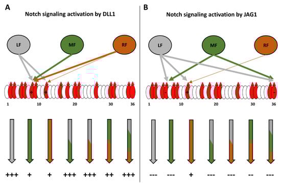 Summary diagram of the effect of the different Fringe combinations on the activation of the NOTCH1 pathway by DLL1 and JAG1. EGFs of the extracellular domain of the N1 receptor are represented by ovals, and red ovals represent EGFs containing the POFUT1 consensus sequence: C2XXXX(S/T)C3. Red triangles represent the presence of O-linked fucose. (A) LFNG (in grey) strongly modifies EGF8 and 12. This results in a strong activation of the N1 pathway by DLL1, whether LFNG is present alone or with MFNG and/or RFNG. MFNG (in green) modifies EGF8 but not EGF12, and RFNG (in orange) modifies EGF8 and slightly EGF12. Consequently, the presence of MFNG or RFNG alone or together results in a lower activation than LFNG of the N1 signaling induced by DLL1. (B) LFNG and MFNG strongly modify EGF6 and 36, inducing a strong inhibition of N1 signaling from JAG1 either alone, together or with RFNG. The ability of LFNG to modify EGF12 is not sufficient to prevent the inhibition induced by the elongation of O-fucoses in EGF6 and 36. RFNG slightly modifies EGF12, which slightly favors the activation of N1 receptor by JAG1 [4]. MFNG modifies EGF6 and potentially 36 with less efficiency than LFNG. Thus, when MFNG and RFNG are present together, the inhibition induced by MFNG is less intense than when it is alone or with LFNG.