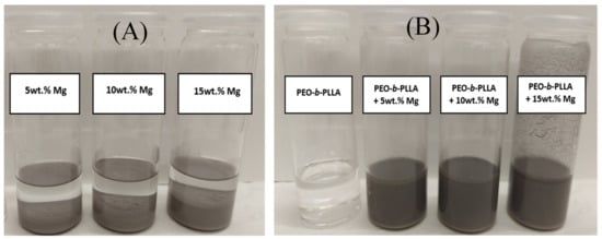 Dispersion tests with 5, 10 and 15 wt.% of Mg filler in CHCl3: (A) in absence and (B) with 10 wt.% of PEO-b-PLLA copolymer after 4 h.