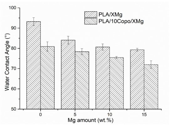 Water Contact Angle of PLA/x Mg and PLA/10 Copo/x Mg composite surfaces versus Mg amount (x = 0, 5, 10 and 15 wt.%).