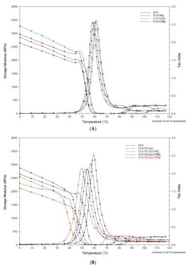 DMTA curves of (A) PLA/x Mg and (B) PLA/10 Copo/x Mg composites (x = 0, 5, 10 and 15 wt.%).